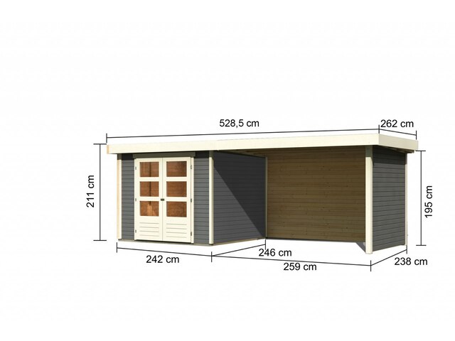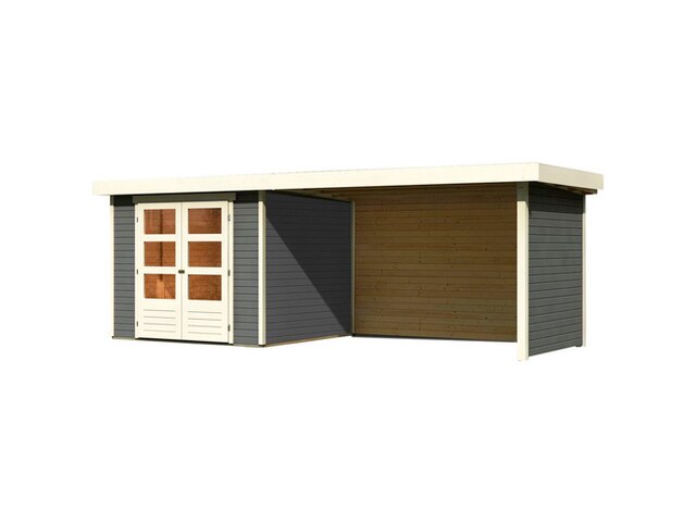 Beliebtester Shop für Karibu Askola 3,5, terragrau, Fichtenholz 19mm, 528,5 x 246 x 211 cm, Flachdach, seitlicher Anbau 2,8m mit Rück- und Seitenwand