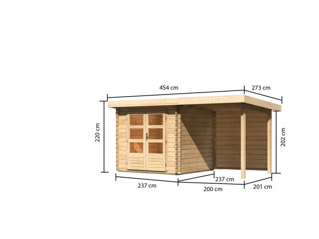 Beliebtester Shop für Karibu Bastrup 2, naturbelassen, Fichtenholz 28mm, 454,5 x 237 x 220 cm, Pultdach, Anbau 2m mit Rückwand