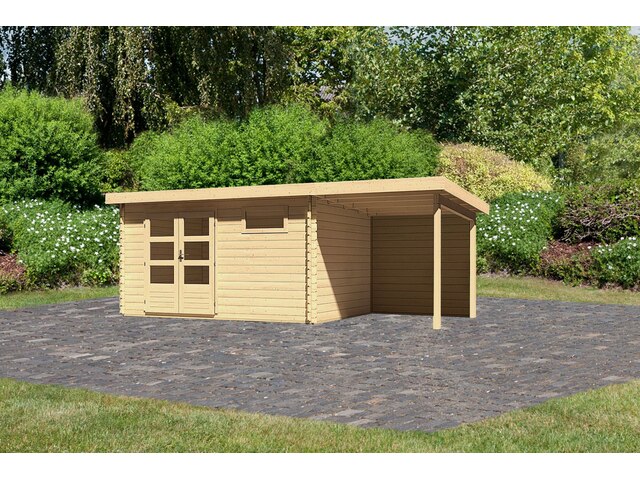 Beliebtester Shop für Karibu Bastrup 8, naturbelassen, Fichtenholz 28mm, 604,5 x 297 x 222 cm, Pultdach, Anbau 2m mit Rückwand