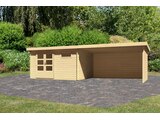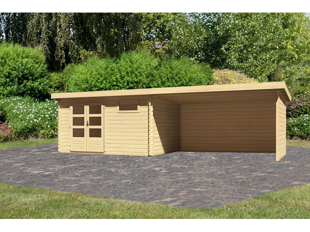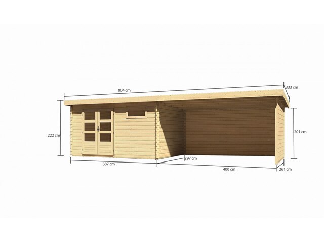 Preisvergleich zu Karibu Bastrup 8, naturbelassen, Fichtenholz 28mm, 804,5 x 297 x 222 cm, Pultdach, Anbau 4m mit Rück- und Seitenwand von 4 Anbietern