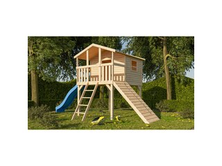 Preisvergleich zu Karibu Benjamin Stelzenhaus, naturbelassen, nordische Fichte, 198x244x309cm, mit Rutsche blau und Holzrampe von 5 Anbietern