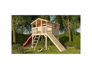 Beliebtester Shop für Karibu Benjamin Stelzenhaus, naturbelassen, nordische Fichte, 198x244x309cm, mit Rutsche rot und Holzrampe