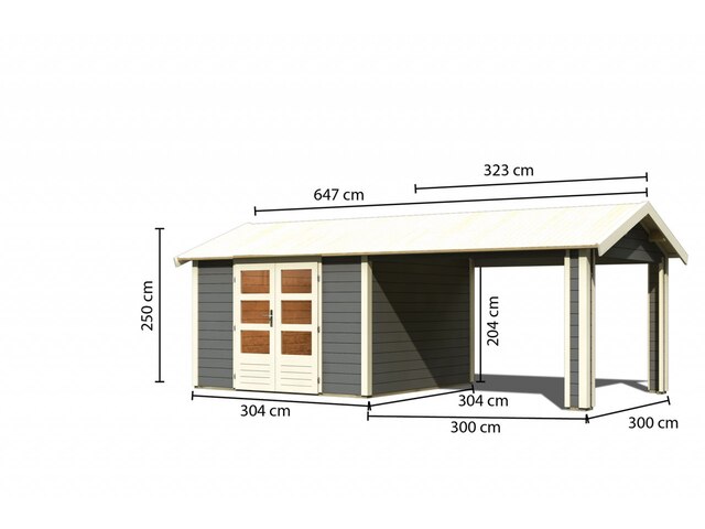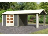 Preisvergleich zu Karibu Theres 7, terragrau, Fichtenholz 28mm, 648 x 304 x 250 cm, Satteldach, inkl. Dachausbauelement von 2 Anbietern