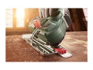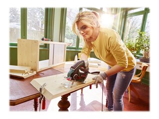 Mitgeliefertes Zubehör | Holzsägeblatt, Antisplitterschutz, Staubabzugshaube, 2 x Tiefenanschlag, Führungsschienenadapter, Sägeblatt-Schutzabdeckung |